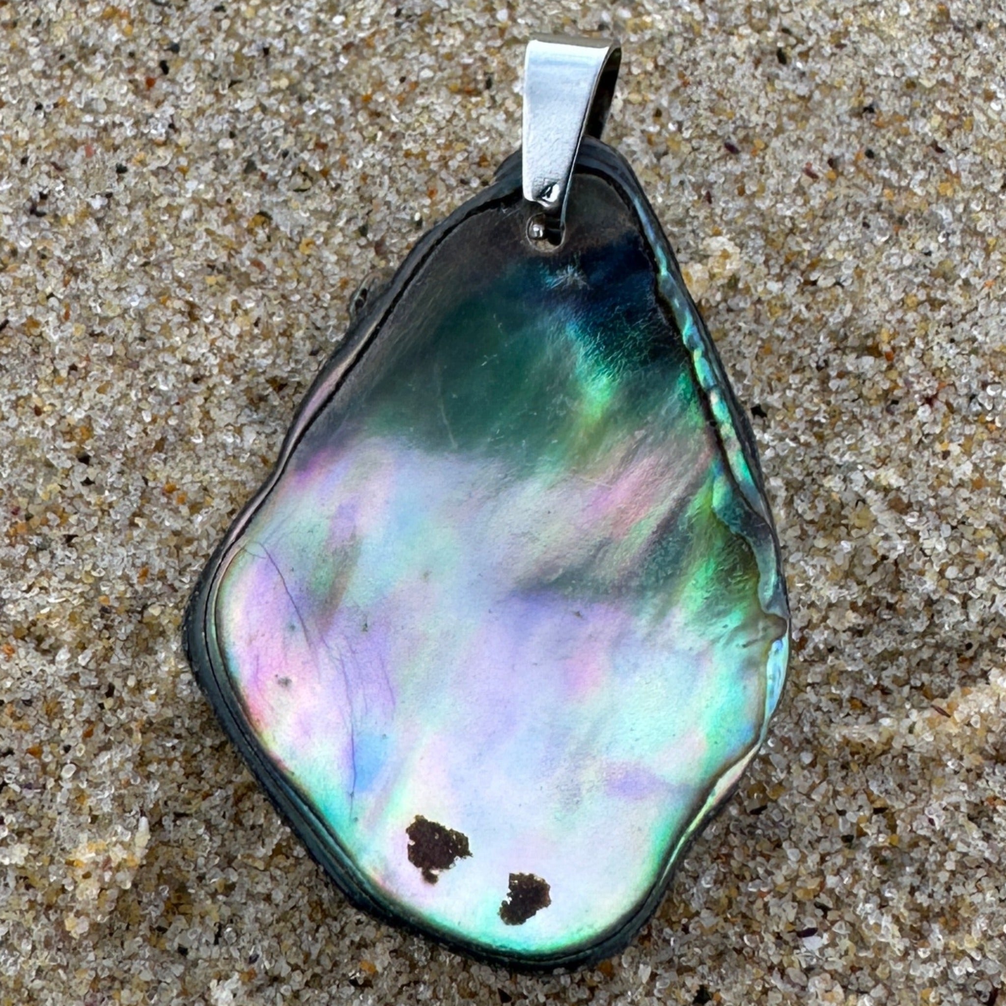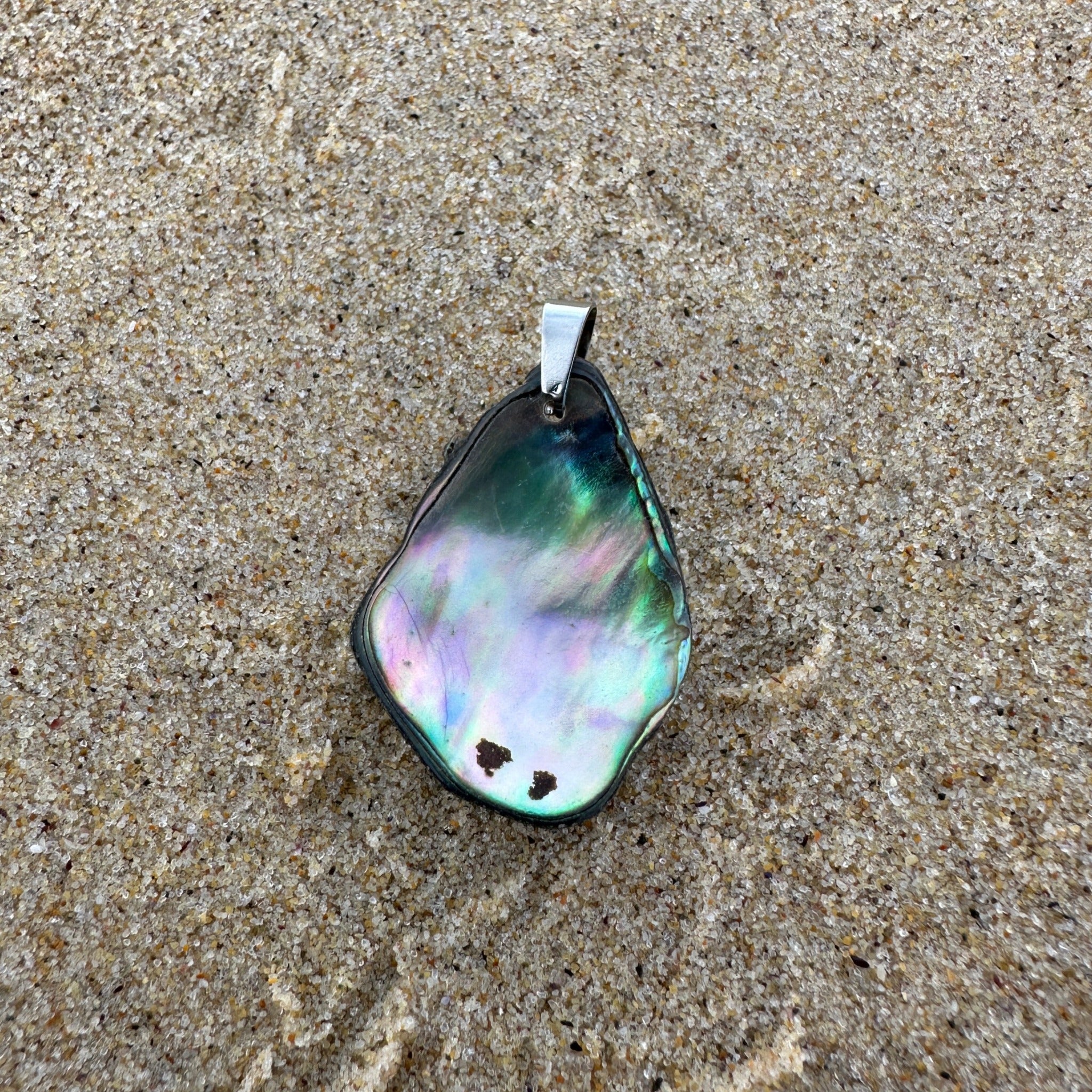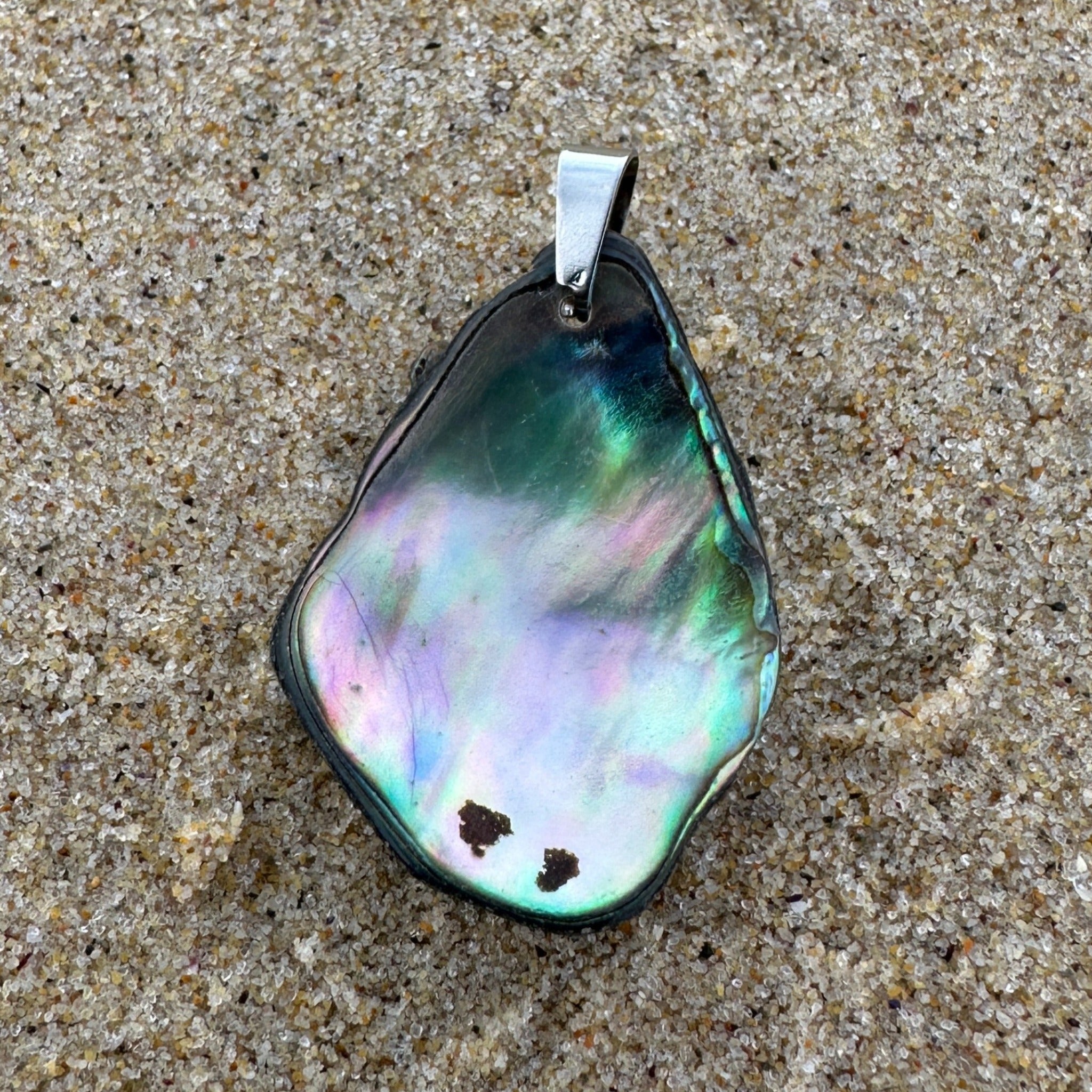 Handmade with genuine NZ Paua Shell, this pendant includes stainless steel bail and a complimentary chain, showcasing vibrant natural colours and unique patterns.
