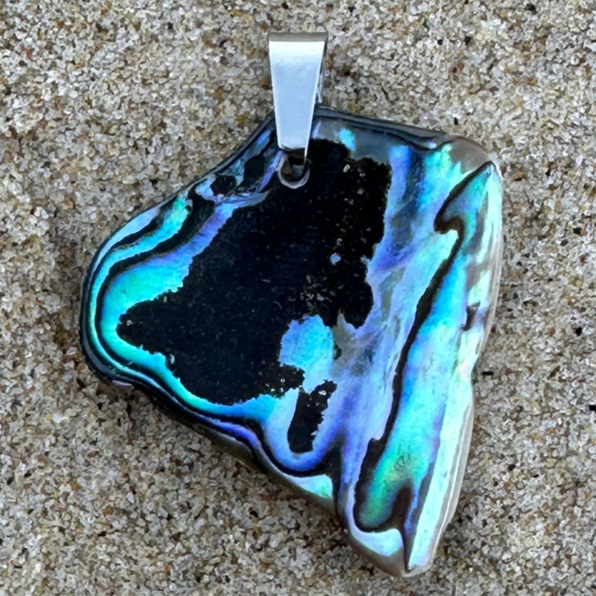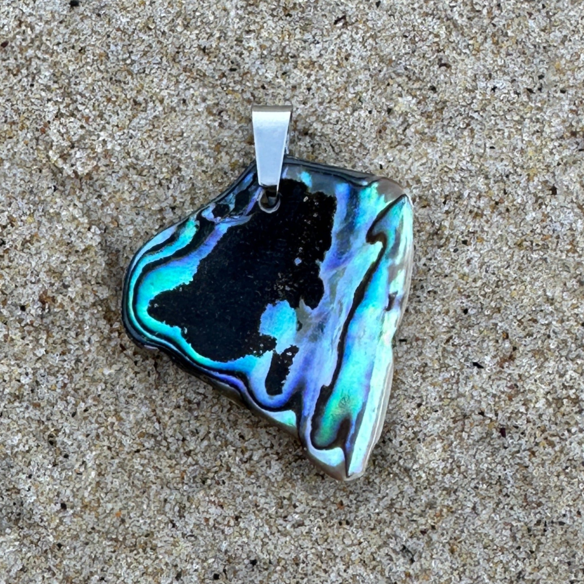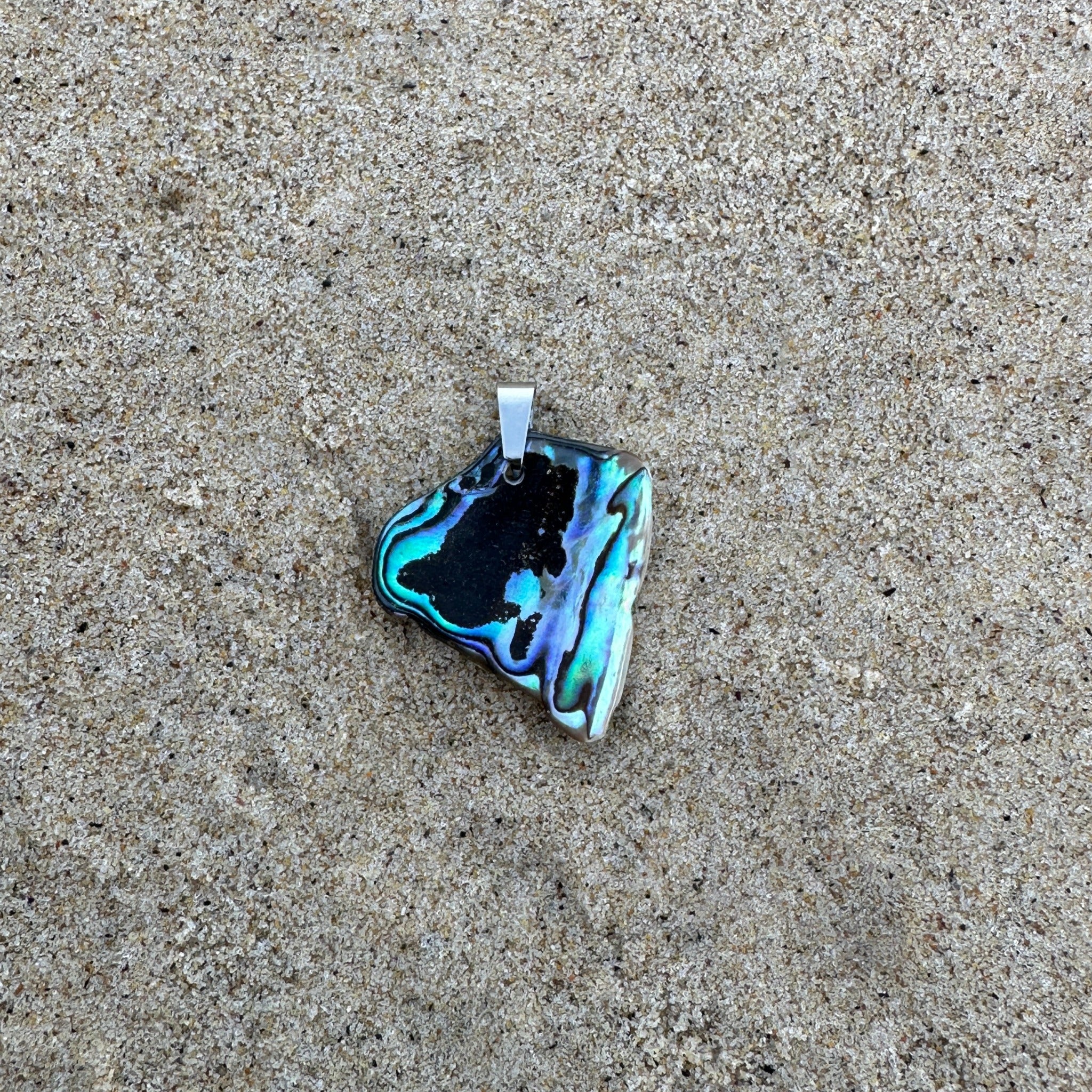 Handcrafted with genuine Paua Shell, this delicate small pendant showcases vibrant colours and unique patterns.